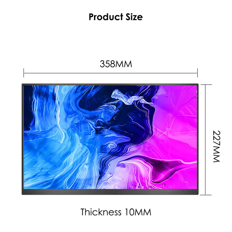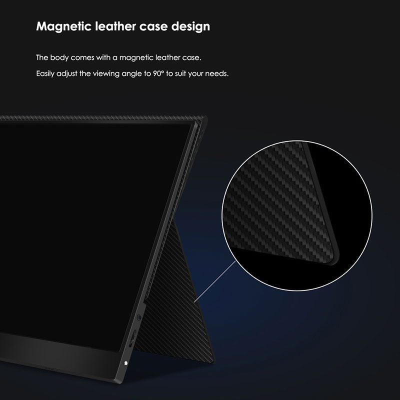 De monitor heeft een lichtgewicht ontwerp (639 g) en een slank profiel (35,8*22,7*1 cm), waardoor hij draagbaar is. Voor uw gemak wordt hij geleverd met een magnetische lederen hoes en een multifunctionele pulsatorknop. Ideaal voor professionals, gamers en multimedialiefhebbers die op zoek zijn naar een hoogwaardige, draagbare beeldschermoplossing.